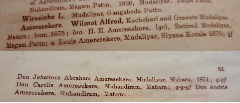 | Wilmot Alfred Ameresekere, Kachcheri and Gravets Mudaliyar, Matara (b.1875/6 d.1939) [2,p31][10,p15] | |||||||||||||||||||||||||||||||||||||||||